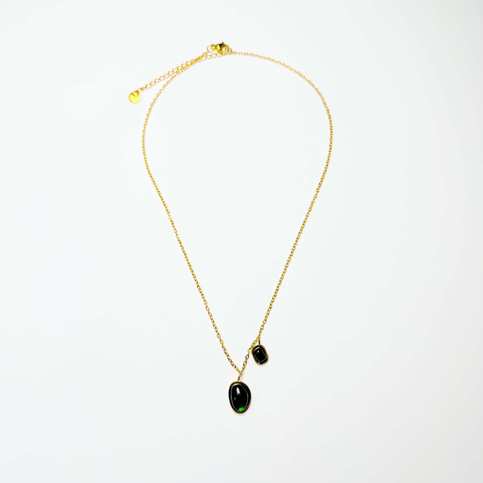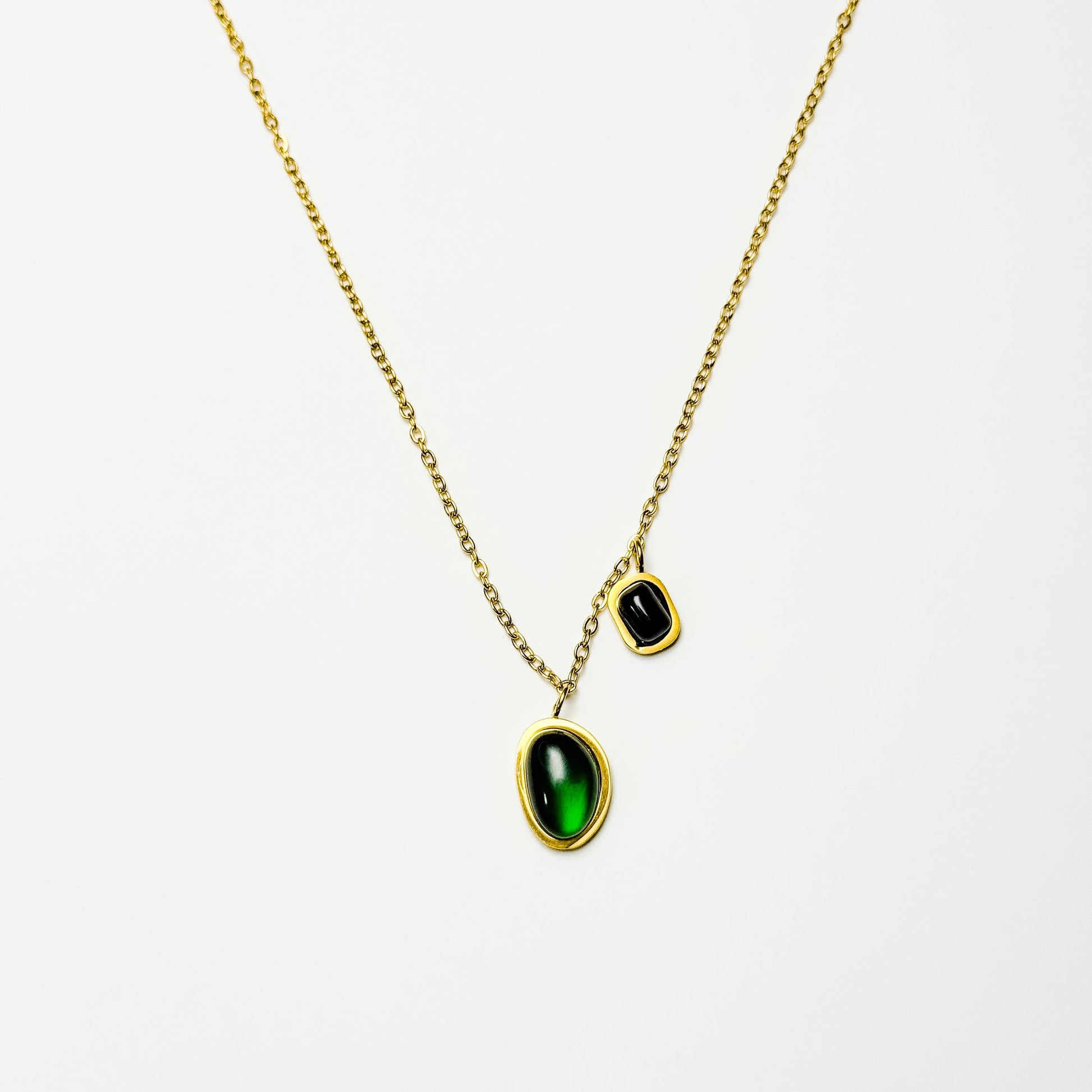 The Alara Twinstone Necklace blends calm color with clean geometry. Two rich green rectangular stones sit one above the other in a slim gold frame, creating a pendant that feels balanced, earthy, and quietly striking. Crafted in waterproof stainless steel and finished in polished gold, this is the kind of minimal charm that completes any outfit — effortlessly.