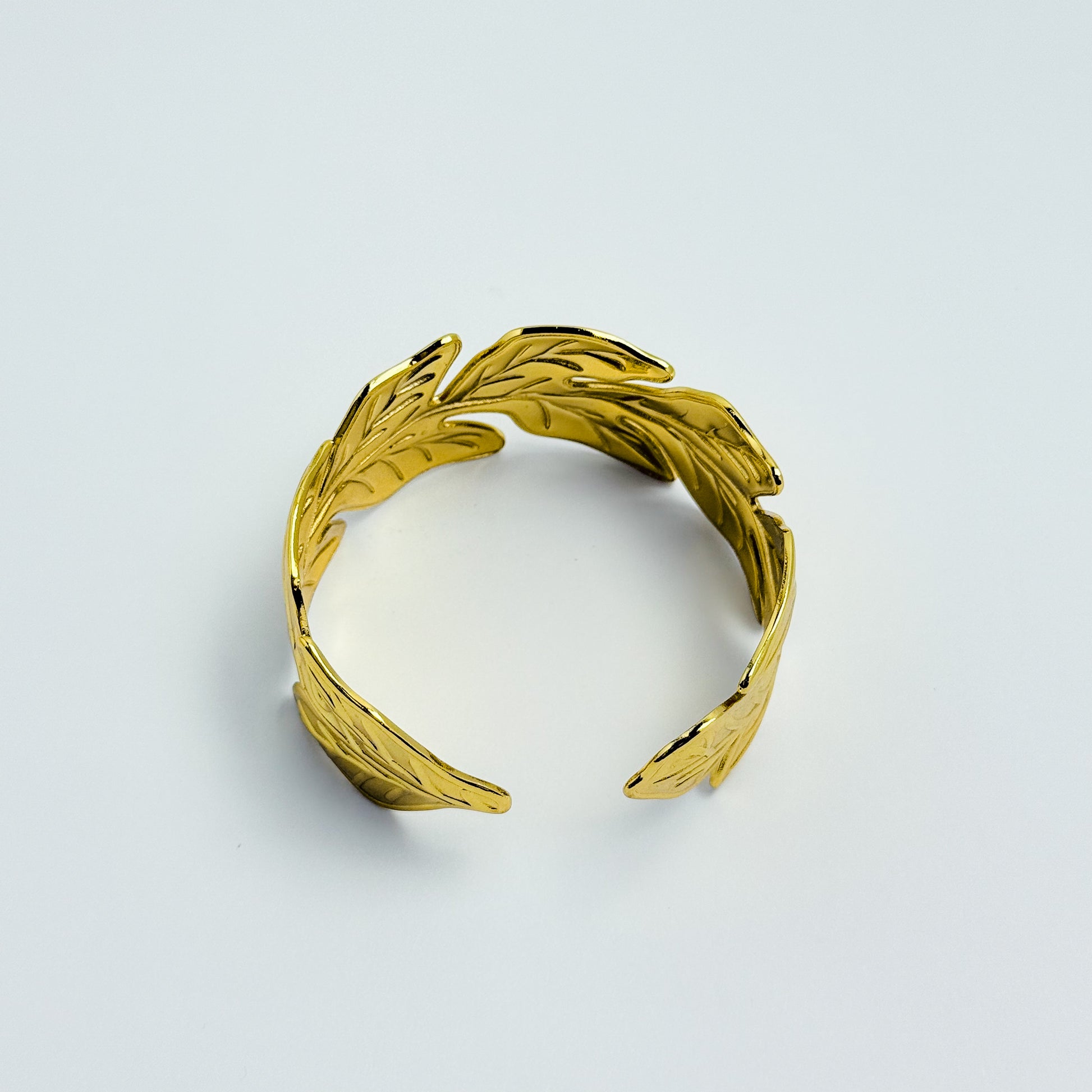 The Golden Sprig is a timeless piece that whispers elegance with every detail. Its gently sculpted leaf texture wraps gracefully around the wrist, inspired by nature’s quiet beauty. Crafted in polished stainless steel with a soft gold finish, this waterproof and tarnish-free bangle is designed to elevate both everyday and occasion wear. Whether stacked or worn solo, it’s the kind of piece that always feels right.