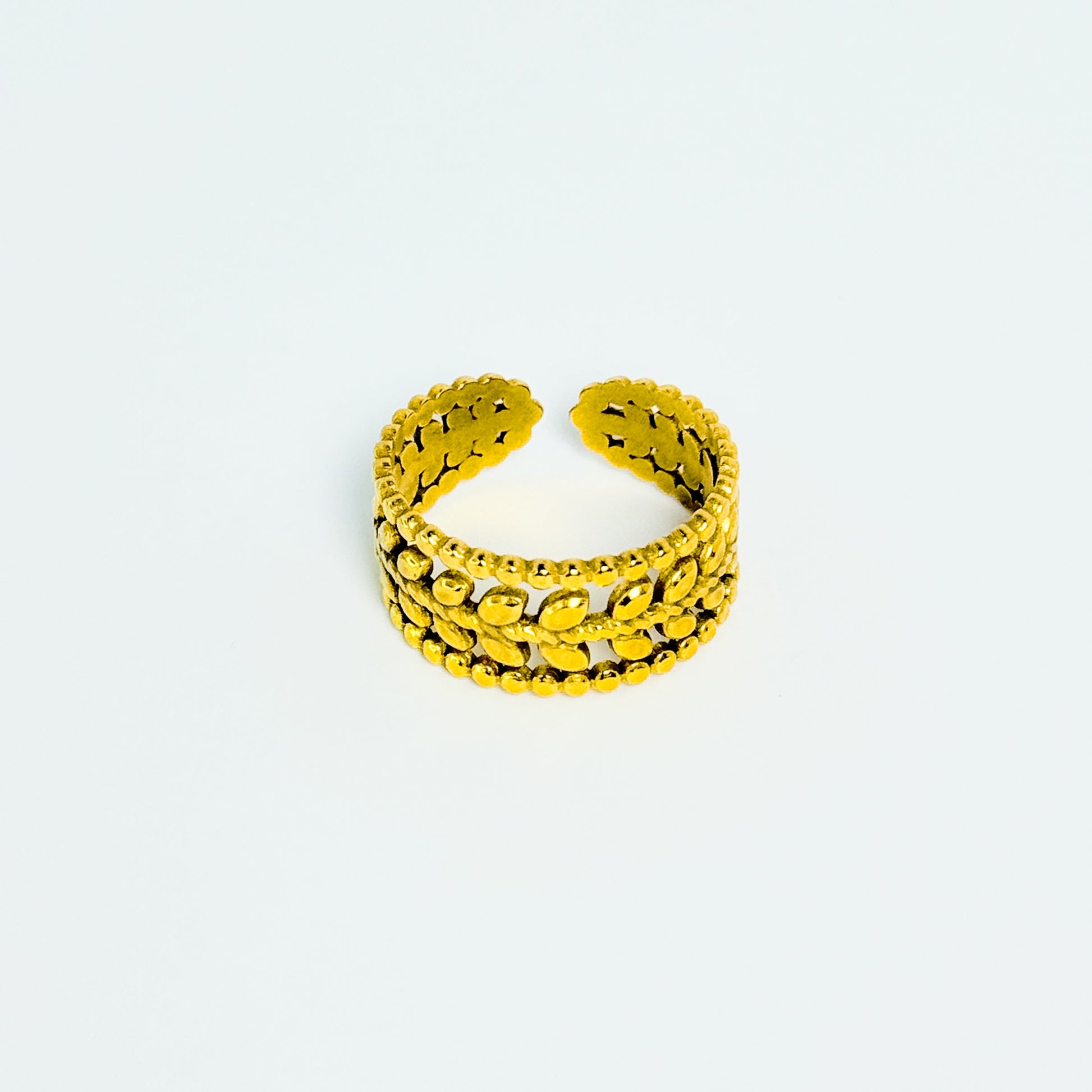 Meet Laurel — a gold-tone stainless steel ring inspired by the laurel wreaths of ancient Greece. Delicate leaves and beaded edges bring heritage charm, while the open, adjustable fit makes it an easy everyday piece. Light, elegant, and timeless — Laurel is a wearable nod to strength and grace.