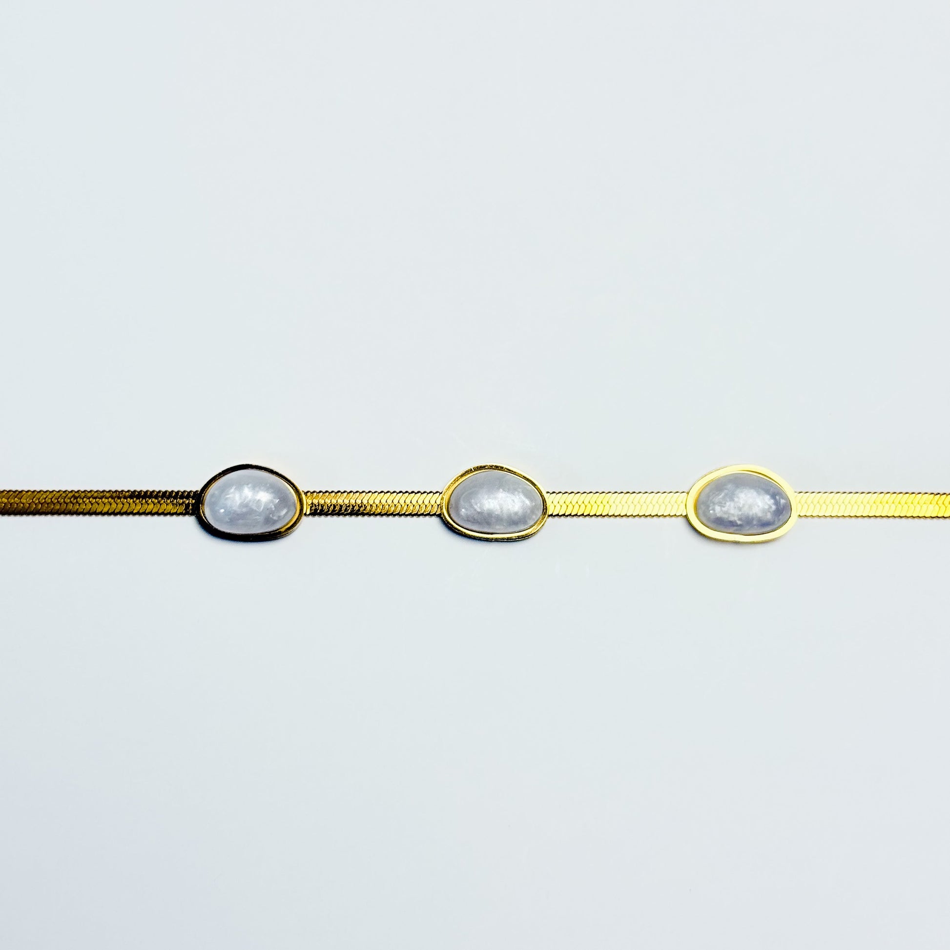 A softly flowing gold snake chain adorned with three luminous white inlays — graceful, polished, and modern.