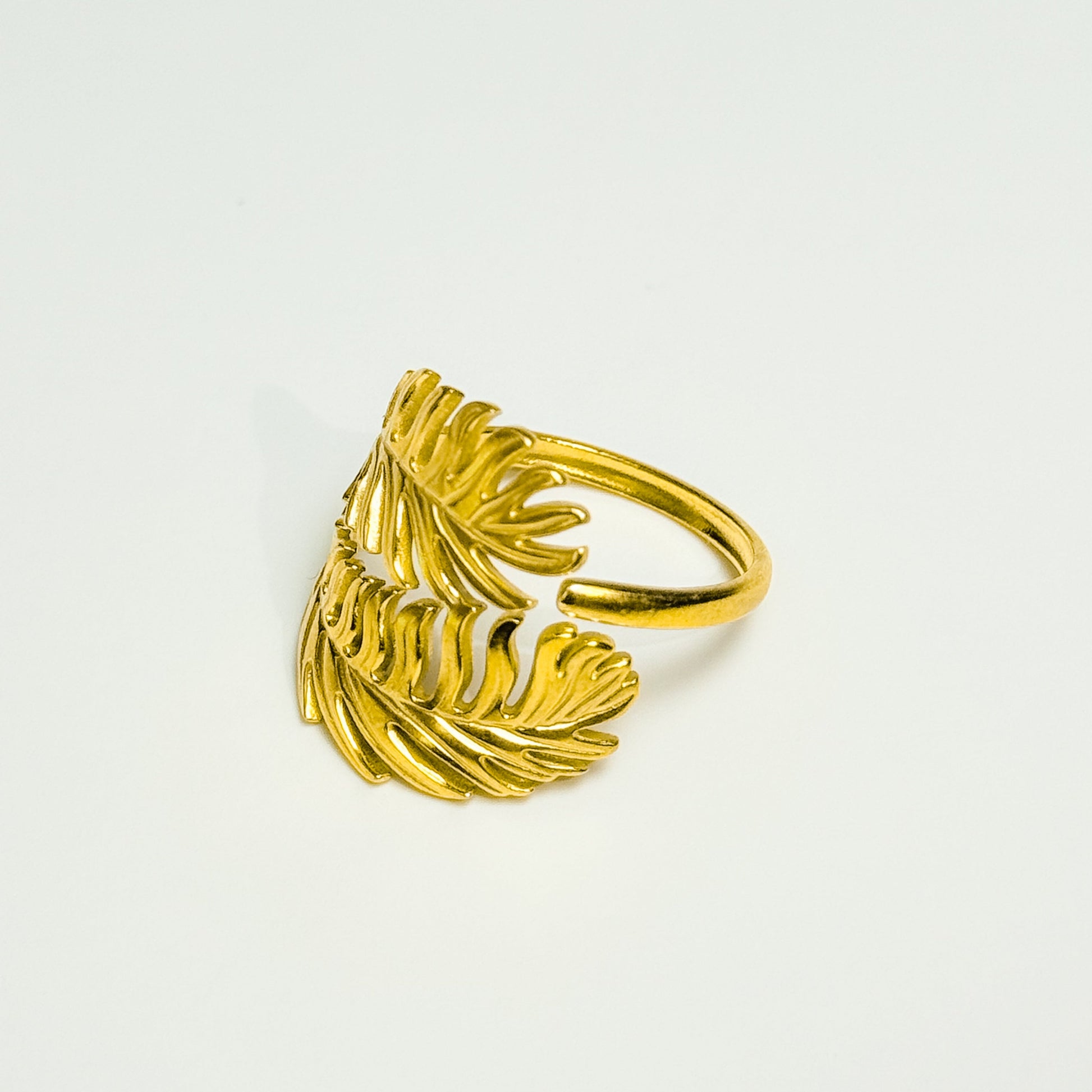 Say hello to Palmera — a ring that brings nature’s grace to your fingertips. Inspired by the silhouette of palm fronds, this golden beauty features a delicate leaf motif that curves softly around the finger in an open, adjustable design.