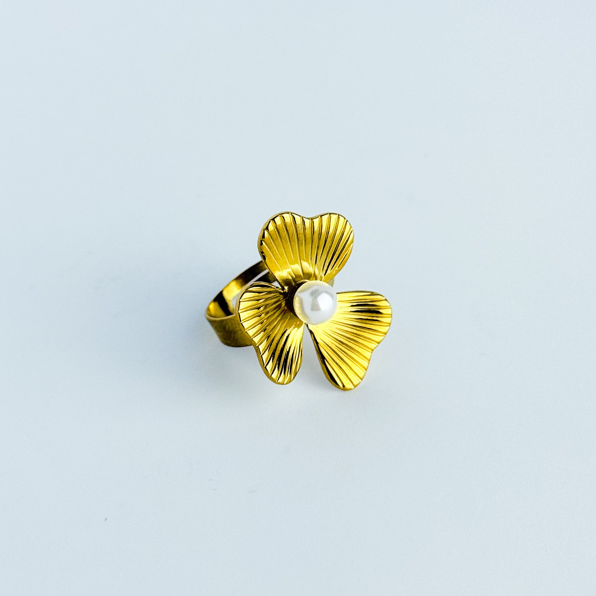 Elevate your everyday glow with Pearlume — a radiant floral ring that brings nature’s poetry to your fingertips. Featuring a triple petal motif with intricate texture, it’s crowned by a luminous pearl centerpiece for a perfect harmony of bold and soft.