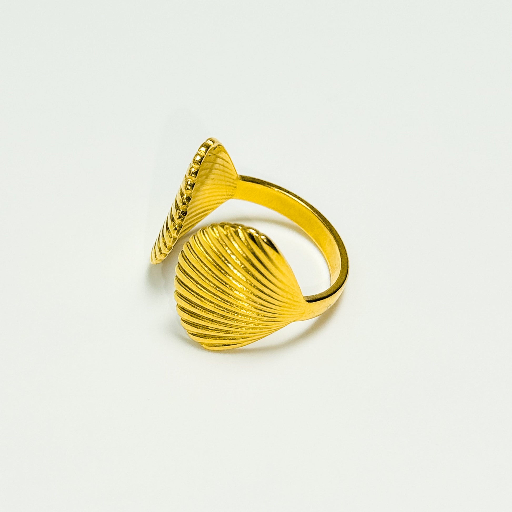 Say hello to Shella, the statement ring that brings a touch of the tide to your fingertips. This open ring features two curved ends sculpted like scallop shells — their rippled texture beautifully catching the light.