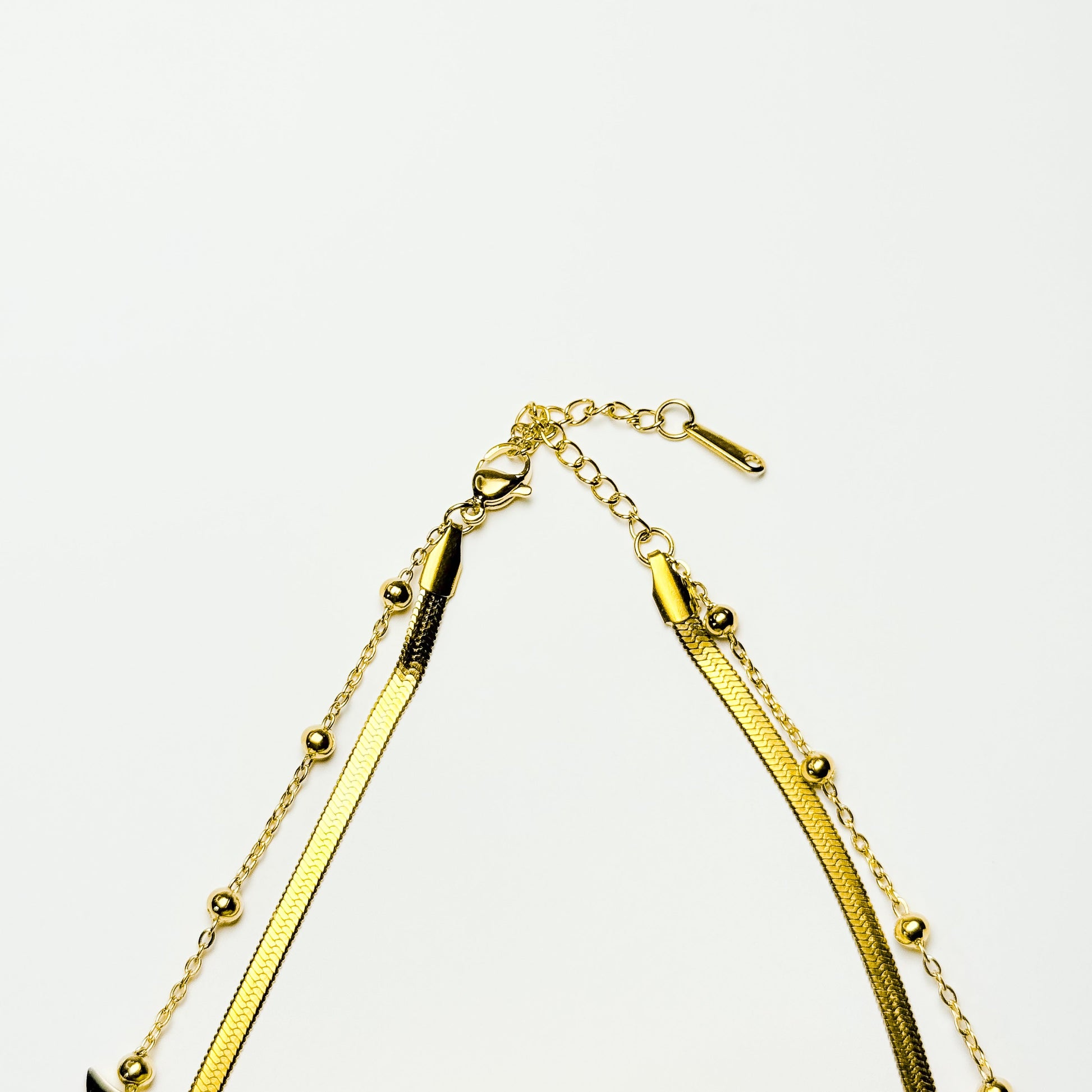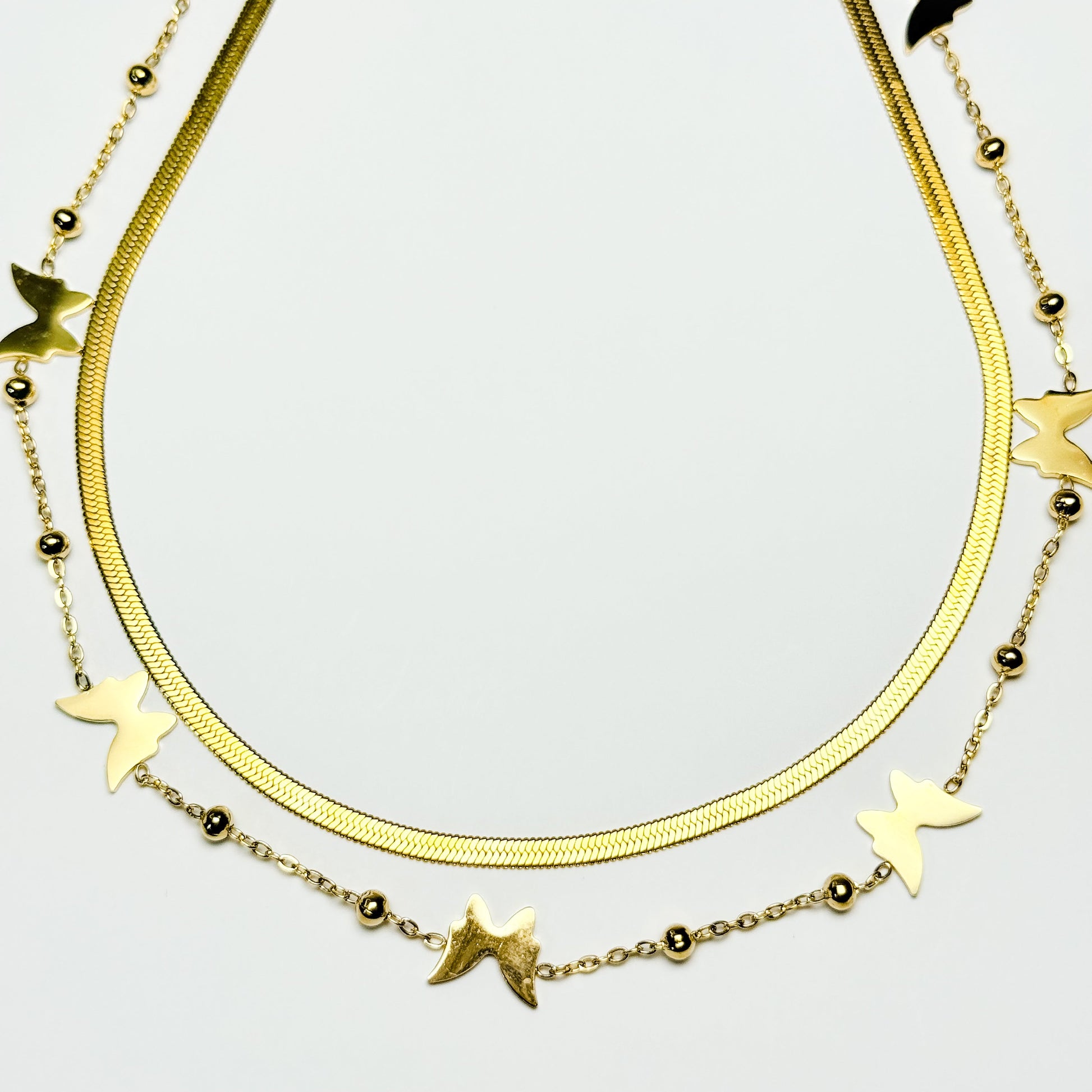 The Velura Flutter Necklace captures the delicate beauty of movement and transformation. Seven butterfly outline charms float gently along the lower chain, accented with polished gold beads between each one. Balanced by a fine plain upper layer, this double-layered design brings a light, symbolic elegance to your everyday style. Crafted in waterproof stainless steel, it’s a quiet statement of femininity and freedom.